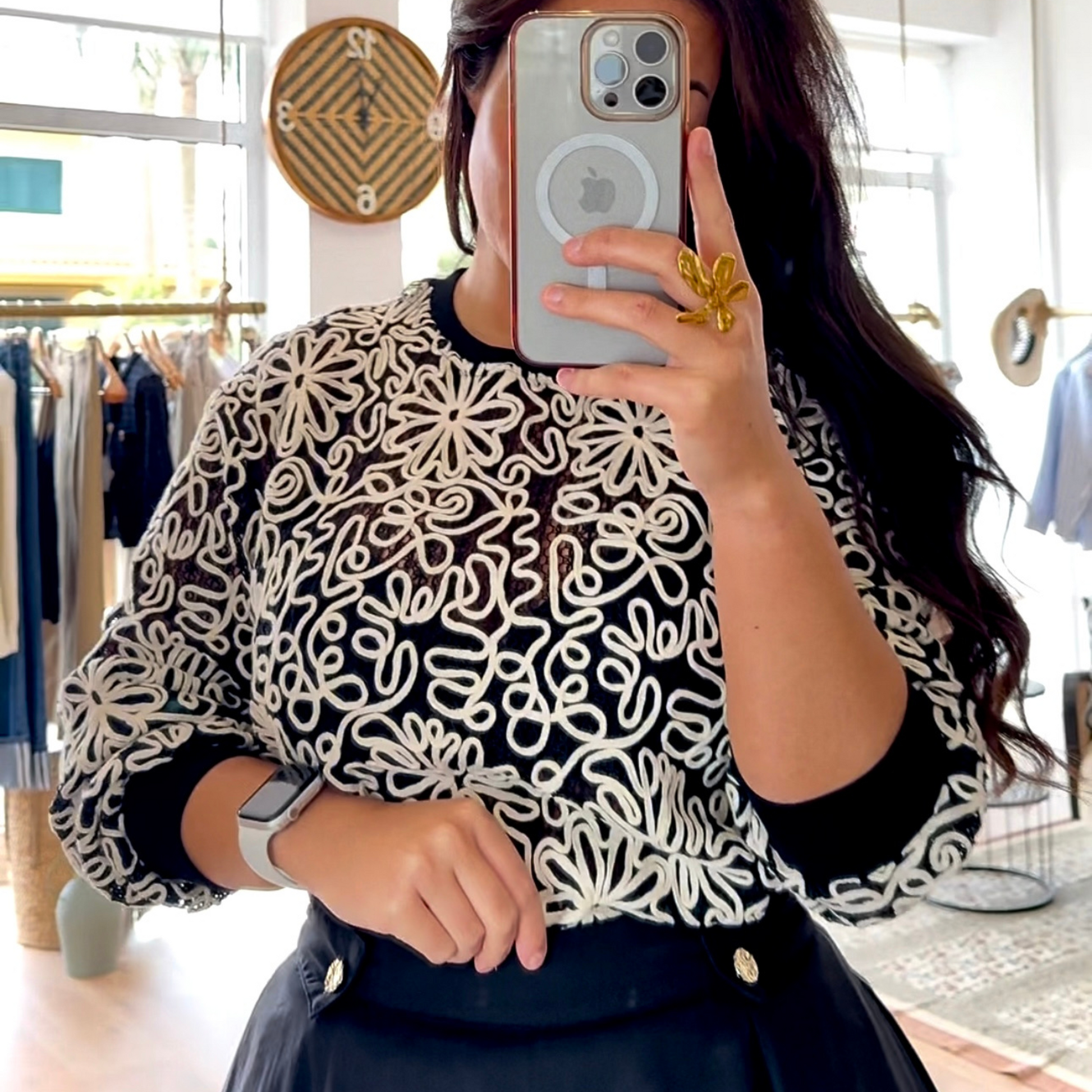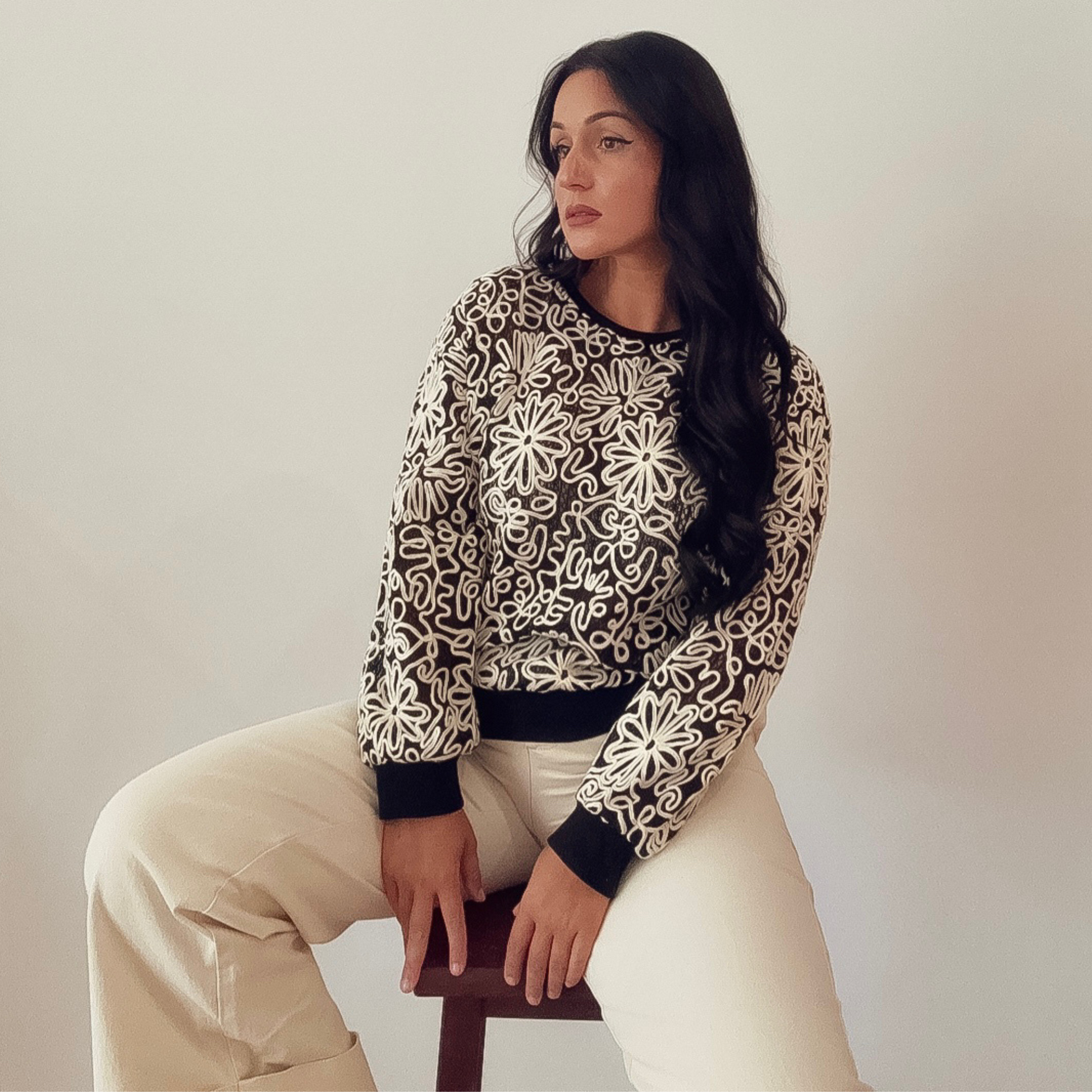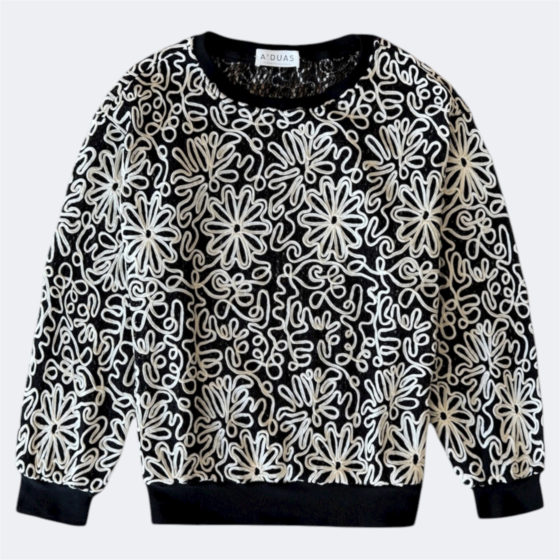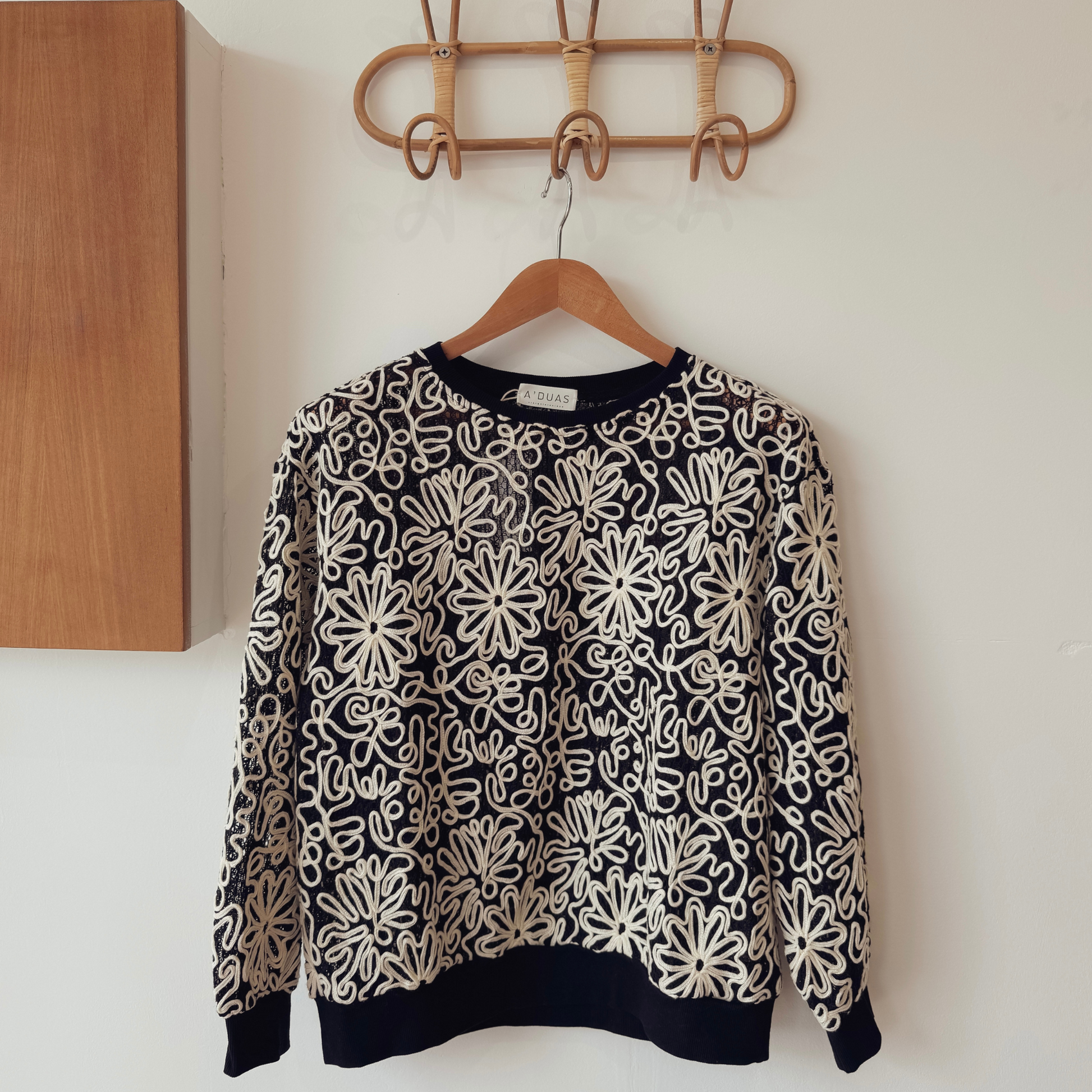 Malha tricotada, com padrão floral. A nossa camisola de trama aberta foi pensada para os dias mais frescos de transição entre as estações de Verão a Outono. Ligeiramente abalonada junto ao punho. Ideal para uma mulher irreverente, mas ao mesmo tempo confortável e sofisticada.