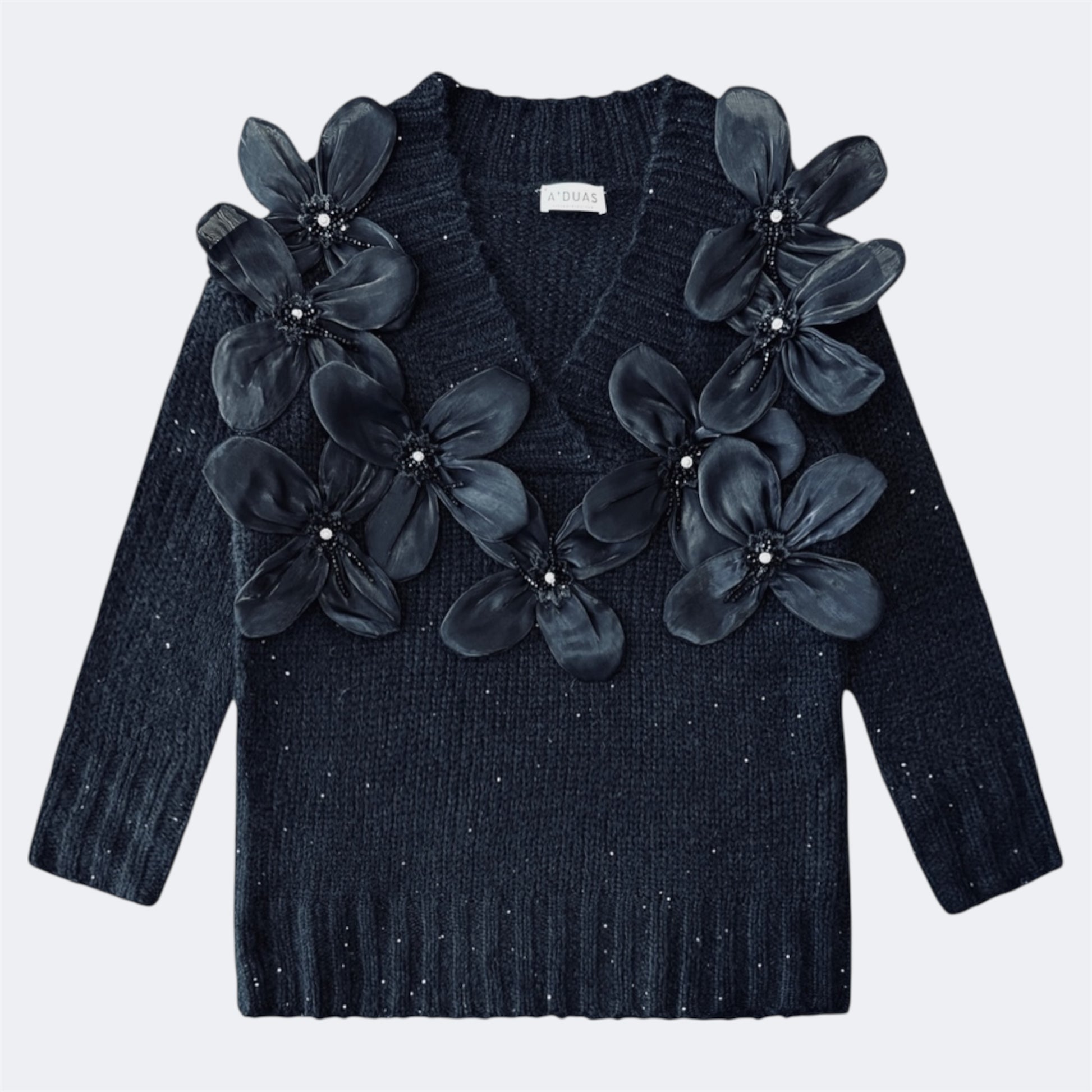 O decote em V alonga a silhueta, enquanto as aplicações em tule e missangas na parte da frente adicionam brilho discreto e um detalhe feminino que faz toda a diferença.