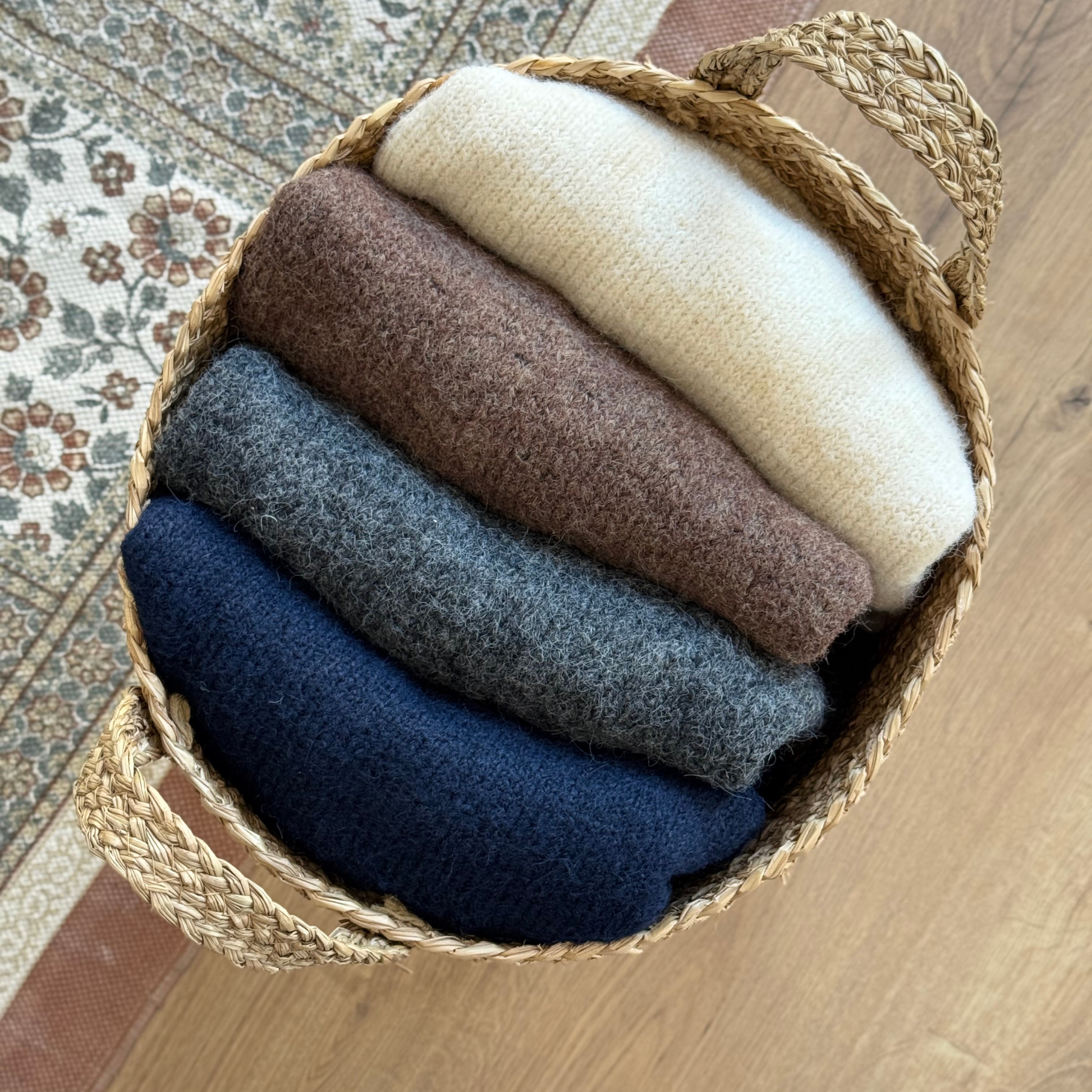 Camisola de malha tricotada disponível em 4 cores: marinho, castanho, cinza e off-white.