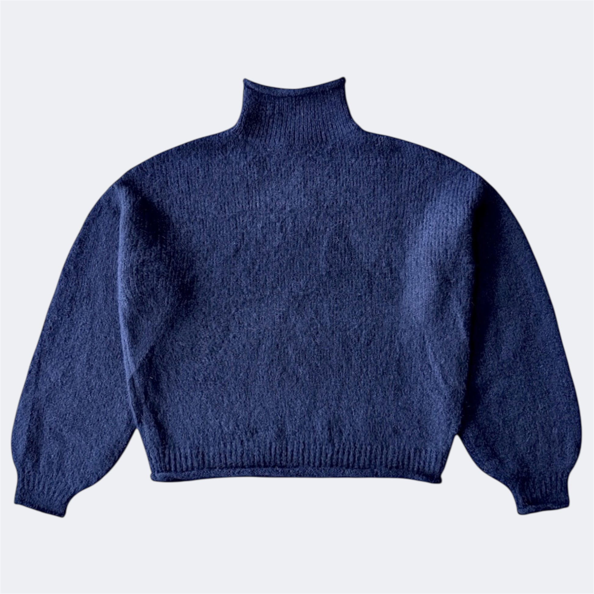 Modelo de meia gola para proteção extra nos dias frios, sem pesar no visual, ombro descaído e mangas ligeiramente abalonadas sem nunca perder a elegância.