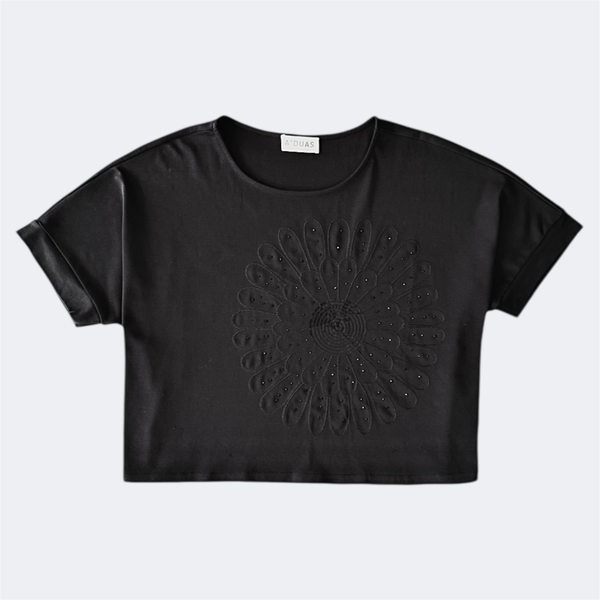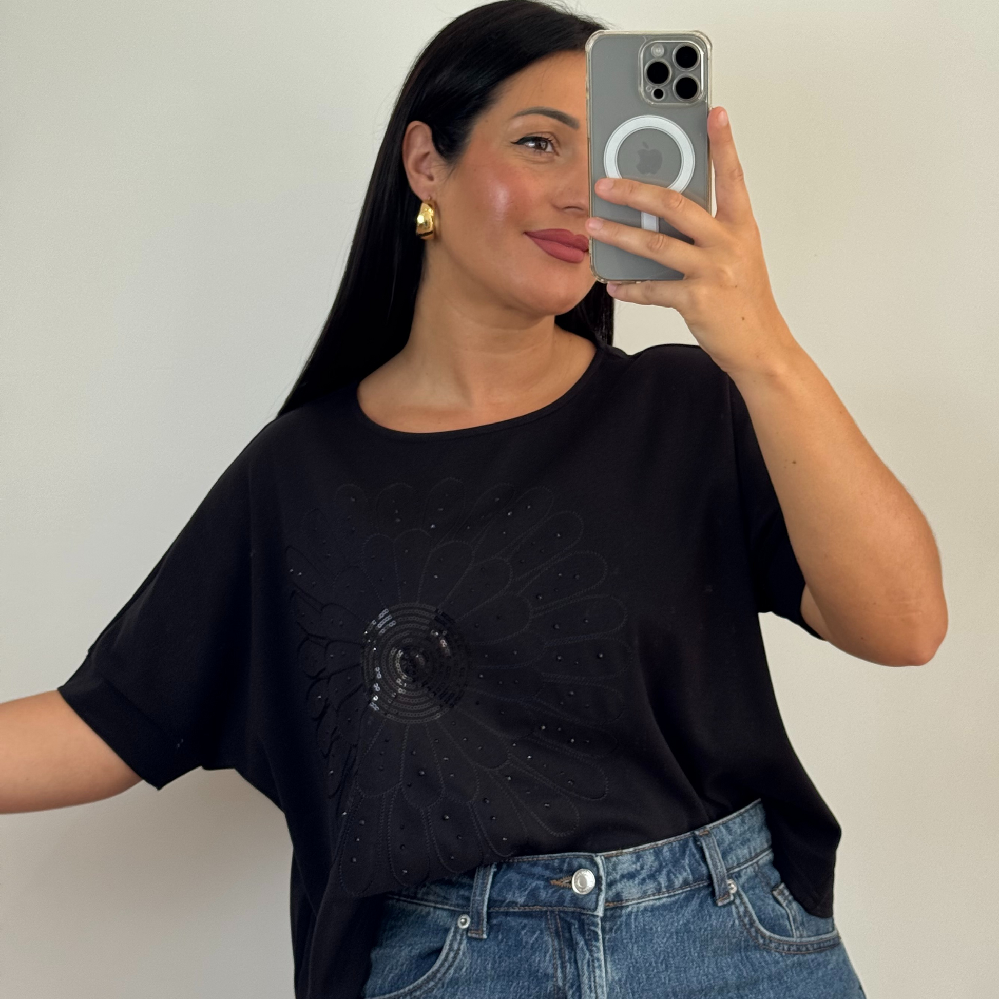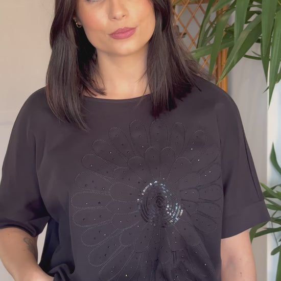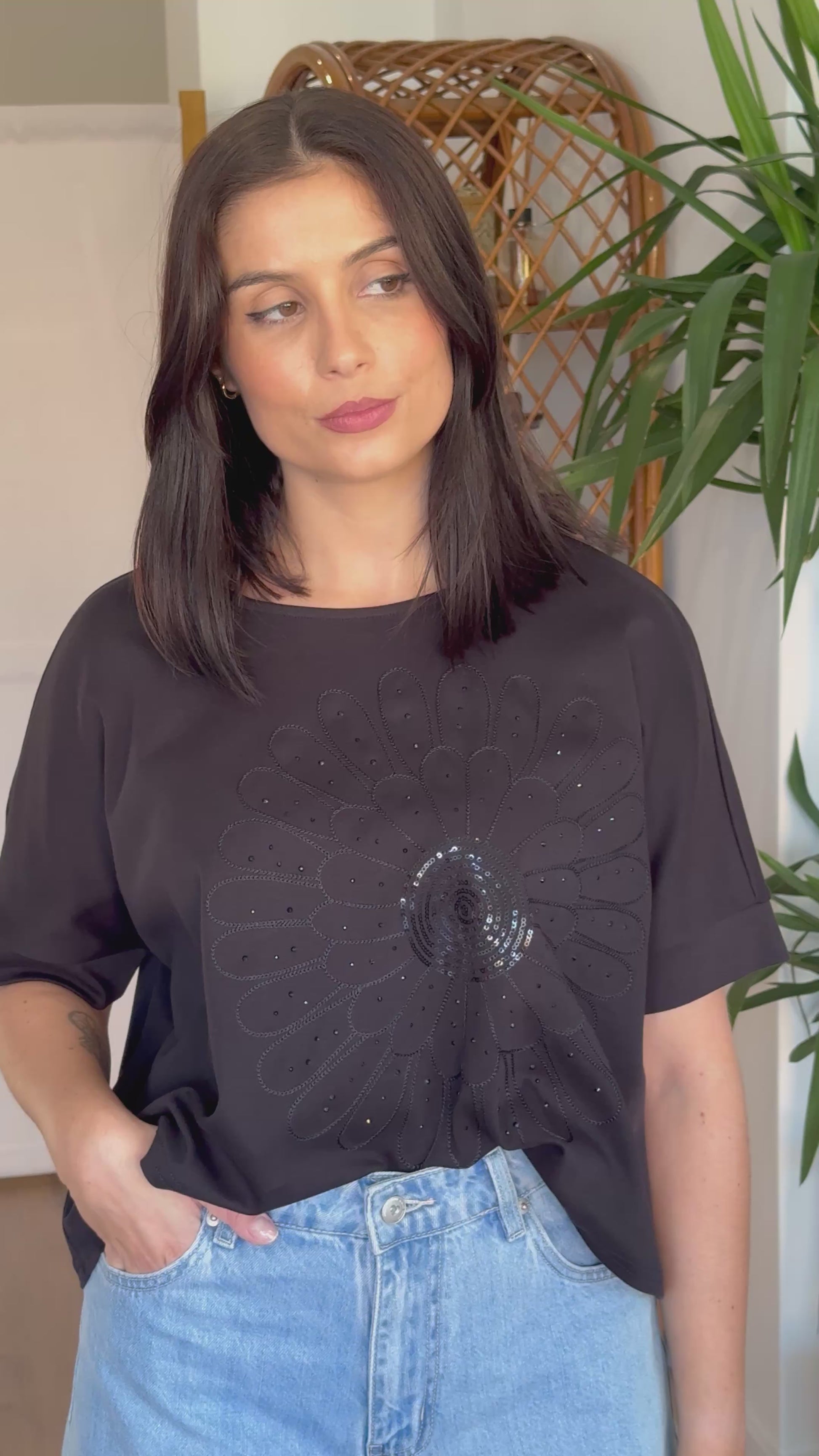 Esta t-shirt com mangas morcego, tem um design moderno e artístico. Confecionada num algodão macio e confortável, esta peça destaca-se pela estampagem frontal com uma flor em brilho subtil, que traz um ar sofisticado e urbano ao visual. Concede um efeito luminoso e elegante sem exageros.