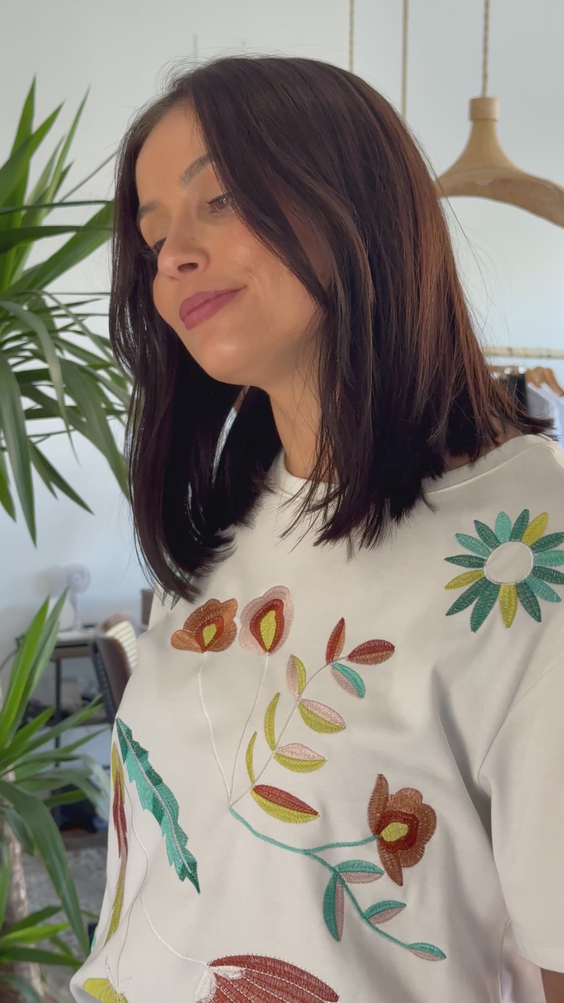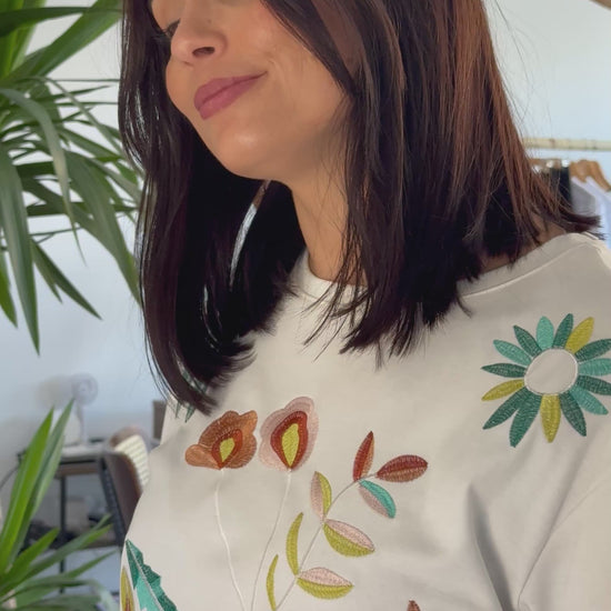 T-shirt com corte clássico e atemporal, confecionada em malha de algodão macio, com toque leve e suave. O grande destaque desta peça está nos bordados artesanais de flores coloridas, feitos com fios de seda, que conferem um acabamento descontraído.